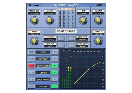 门限器,扩展器,压缩器,限制器和2频段侧链均衡器 温暖的额外存在和管状饱和度 3种不同压缩机类型; 普通,经典和线性 可变软膝; 0 dBr至-20 dBr,步长为5 dB 环绕总线压缩器和限制器(仅限HD-HDX) 低噪音和失真 广受好评的索尼OXF-R3控制台的压缩器部分